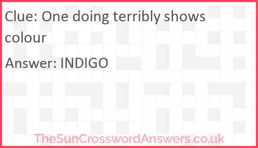 One doing terribly shows colour is a crossword clue for which we have 1 possible answer and we have spotted 1 times in our database. This crossword clue was last seen on 13 October 2022 in The Sun Cryptic Crossword puzzle!