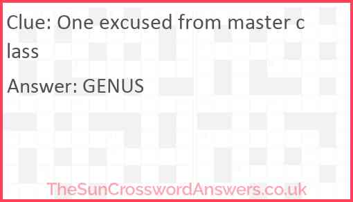 One excused from master class is a crossword clue for which we have 1 possible answer and we have spotted 1 times in our database. This crossword clue was last seen on 11 October 2019 in The Sun Cryptic Crossword puzzle!