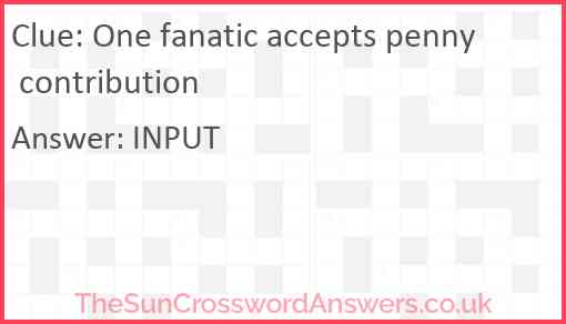 One fanatic accepts penny contribution is a crossword clue for which we have 1 possible answer and we have spotted 3 times in our database. This crossword clue was last seen on 16 January 2025 in The Sun Cryptic Crossword puzzle!