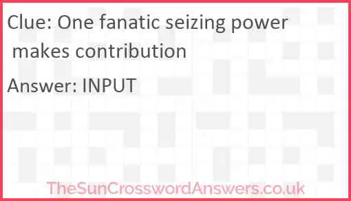 One fanatic seizing power makes contribution is a crossword clue for which we have 1 possible answer and we have spotted 1 times in our database. This crossword clue was last seen on 24 May 2021 in The Sun Cryptic Crossword puzzle!