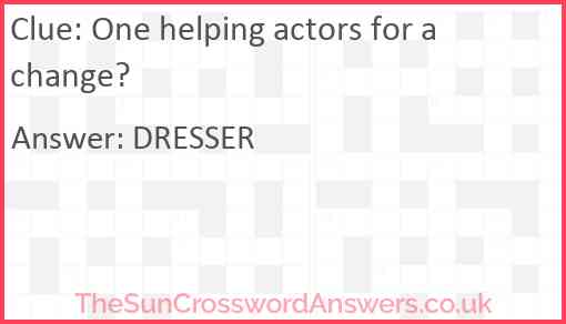 One helping actors for a change? is a crossword clue for which we have 1 possible answer and we have spotted 3 times in our database. This crossword clue was last seen on 08 January 2023 in The Sun Cryptic Crossword puzzle!