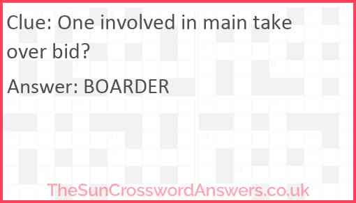 One involved in main takeover bid? is a crossword clue for which we have 1 possible answer and we have spotted 1 times in our database. This crossword clue was last seen on 17 June 2024 in The Sun Cryptic Crossword puzzle!