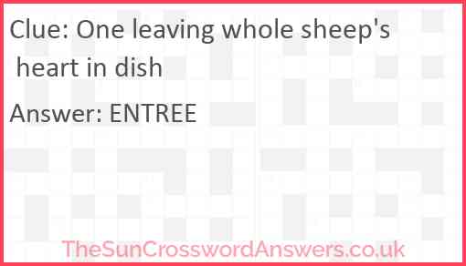One leaving whole sheep's heart in dish is a crossword clue for which we have 1 possible answer and we have spotted 4 times in our database. This crossword clue was last seen on 28 June 2025 in The Sun Cryptic Crossword puzzle!
