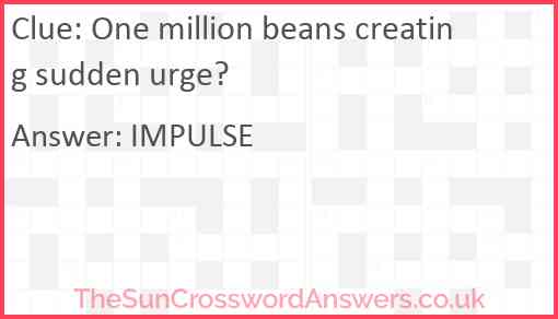 One million beans creating sudden urge? is a crossword clue for which we have 1 possible answer and we have spotted 1 times in our database. This crossword clue was last seen on 21 December 2022 in The Sun Cryptic Crossword puzzle!