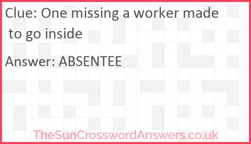 One missing a worker made to go inside is a crossword clue for which we have 1 possible answer and we have spotted 4 times in our database. This crossword clue was last seen on 14 April 2025 in The Sun Cryptic Crossword puzzle!