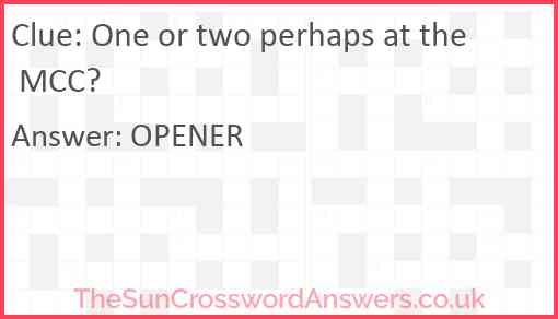 One or two perhaps at the MCC? is a crossword clue for which we have 1 possible answer and we have spotted 4 times in our database. This crossword clue was last seen on 23 April 2024 in The Sun Cryptic Crossword puzzle!