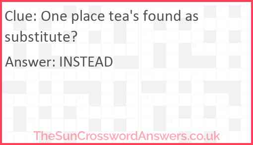 One place tea's found as substitute? is a crossword clue for which we have 1 possible answer and we have spotted 1 times in our database. This crossword clue was last seen on 03 October 2019 in The Sun Cryptic Crossword puzzle!