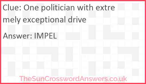 One politician with extremely exceptional drive is a crossword clue for which we have 1 possible answer and we have spotted 2 times in our database. This crossword clue was last seen on 10 June 2024 in The Sun Cryptic Crossword puzzle!