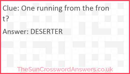 One running from the front? is a crossword clue for which we have 1 possible answer and we have spotted 2 times in our database. This crossword clue was last seen on 08 July 2024 in The Sun Cryptic Crossword puzzle!