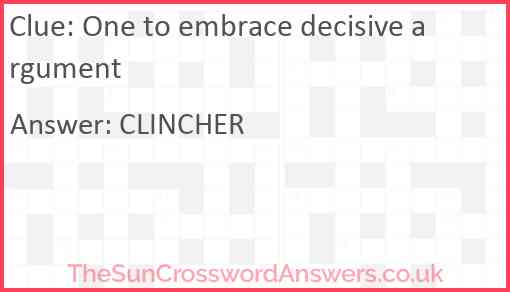 One to embrace decisive argument is a crossword clue for which we have 1 possible answer and we have spotted 1 times in our database. This crossword clue was last seen on 18 August 2024 in The Sun Cryptic Crossword puzzle!