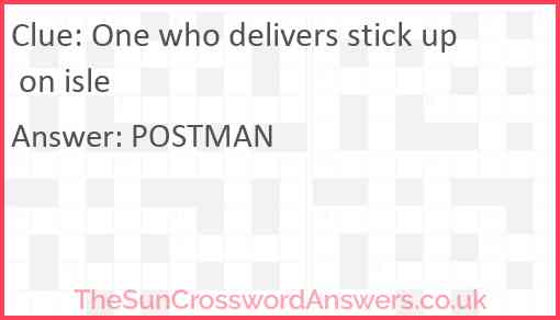 One who delivers stick up on isle is a crossword clue for which we have 1 possible answer and we have spotted 1 times in our database. This crossword clue was last seen on 09 March 2024 in The Sun Cryptic Crossword puzzle!