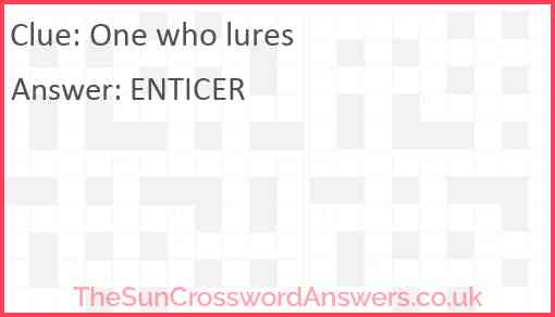 One who lures is a crossword clue for which we have 1 possible answer and we have spotted 1 times in our database. This crossword clue was last seen on 18 November 2021 in The Sun Coffee Time Crossword puzzle!