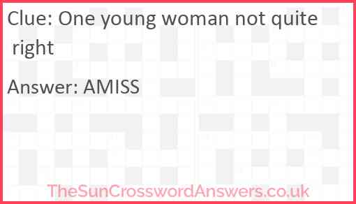 One young woman not quite right is a crossword clue for which we have 1 possible answer and we have spotted 2 times in our database. This crossword clue was last seen on 21 December 2020 in The Sun Cryptic Crossword puzzle!
