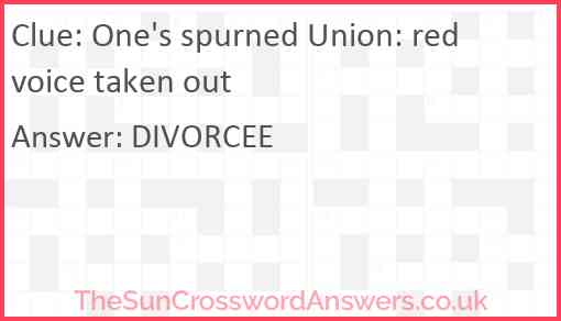 One's spurned Union: red voice taken out is a crossword clue for which we have 1 possible answer and we have spotted 1 times in our database. This crossword clue was last seen on 21 May 2021 in The Sun Cryptic Crossword puzzle!