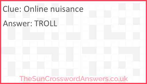 Online nuisance is a crossword clue for which we have 1 possible answer and we have spotted 4 times in our database. This crossword clue was last seen on 23 April 2022 in The Sun Coffee Time Crossword puzzle!