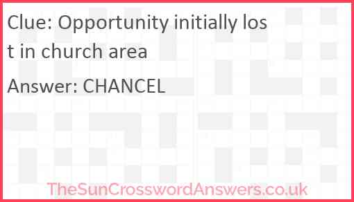 Opportunity initially lost in church area is a crossword clue for which we have 1 possible answer and we have spotted 1 times in our database. This crossword clue was last seen on 17 December 2020 in The Sun Cryptic Crossword puzzle!