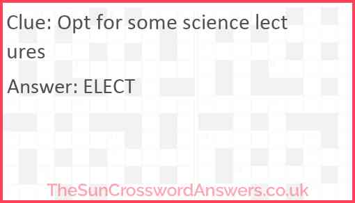 Opt for some science lectures is a crossword clue for which we have 1 possible answer and we have spotted 4 times in our database. This crossword clue was last seen on 13 November 2023 in The Sun Cryptic Crossword puzzle!