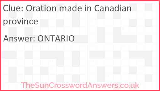 Oration made in Canadian province is a crossword clue for which we have 1 possible answer and we have spotted 1 times in our database. This crossword clue was last seen on 27 October 2018 in The Sun Cryptic Crossword puzzle!