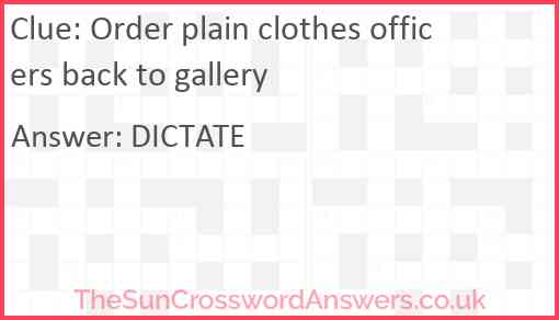 Order plain clothes officers back to gallery is a crossword clue for which we have 1 possible answer and we have spotted 1 times in our database. This crossword clue was last seen on 31 January 2022 in The Sun Cryptic Crossword puzzle!