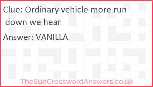 Ordinary vehicle more run down we hear is a crossword clue for which we have 1 possible answer and we have spotted 1 times in our database. This crossword clue was last seen on 03 August 2023 in The Sun Cryptic Crossword puzzle!
