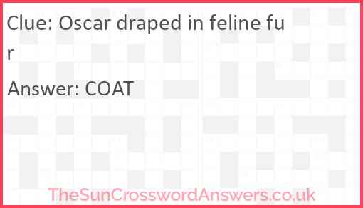 Oscar draped in feline fur is a crossword clue for which we have 1 possible answer and we have spotted 3 times in our database. This crossword clue was last seen on 31 July 2023 in The Sun Cryptic Crossword puzzle!