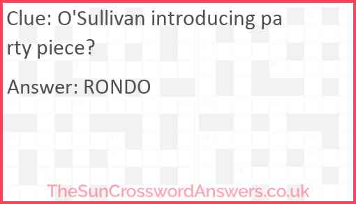 O'Sullivan introducing party piece? is a crossword clue for which we have 1 possible answer and we have spotted 1 times in our database. This crossword clue was last seen on 22 March 2022 in The Sun Cryptic Crossword puzzle!
