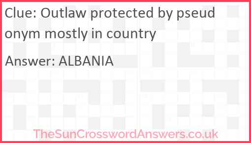 Outlaw protected by pseudonym mostly in country is a crossword clue for which we have 1 possible answer and we have spotted 1 times in our database. This crossword clue was last seen on 31 December 2023 in The Sun Cryptic Crossword puzzle!