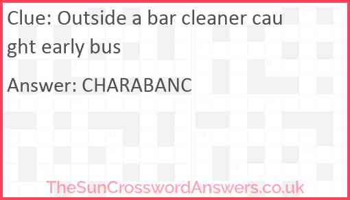 Outside a bar cleaner caught early bus is a crossword clue for which we have 1 possible answer and we have spotted 1 times in our database. This crossword clue was last seen on 15 August 2024 in The Sun Cryptic Crossword puzzle!