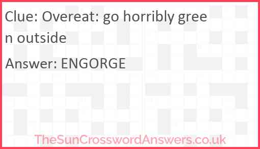 Overeat: go horribly green outside is a crossword clue for which we have 1 possible answer and we have spotted 2 times in our database. This crossword clue was last seen on 30 August 2023 in The Sun Cryptic Crossword puzzle!