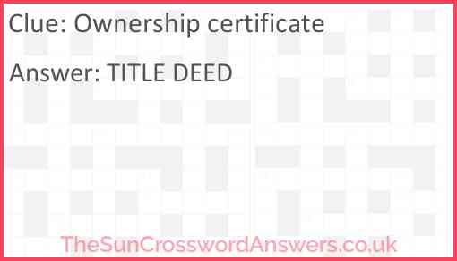 Ownership certificate is a crossword clue for which we have 2 possible answer and we have spotted 5 times in our database. This crossword clue was last seen on 24 April 2024 in The Sun Coffee Time Crossword puzzle!