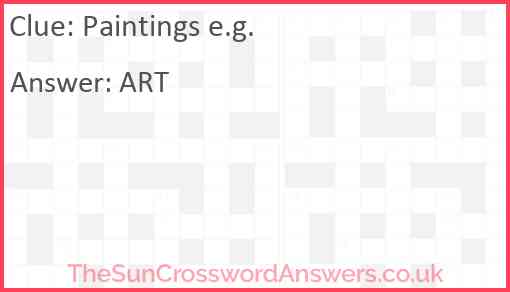 Paintings e.g. is a crossword clue for which we have 1 possible answer and we have spotted 2 times in our database. This crossword clue was last seen on 08 December 2024 in The Sun Coffee Time Crossword puzzle!