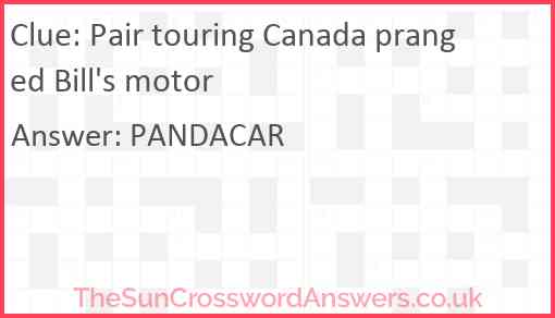 Pair touring Canada pranged Bill's motor is a crossword clue for which we have 1 possible answer and we have spotted 1 times in our database. This crossword clue was last seen on 17 January 2022 in The Sun Cryptic Crossword puzzle!