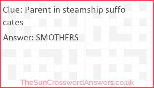 Parent in steamship suffocates is a crossword clue for which we have 1 possible answer and we have spotted 1 times in our database. This crossword clue was last seen on 22 May 2024 in The Sun Cryptic Crossword puzzle!