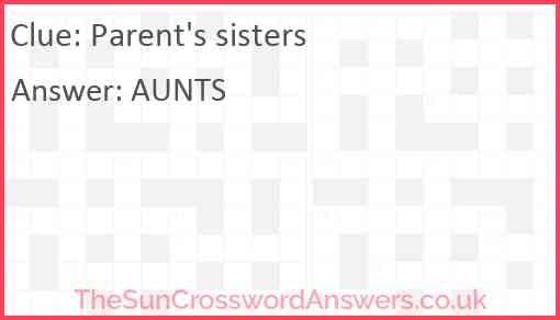 Parent's sisters is a crossword clue for which we have 1 possible answer and we have spotted 9 times in our database. This crossword clue was last seen on 13 March 2025 in The Sun Coffee Time Crossword puzzle!
