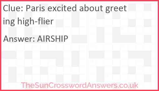 Paris excited about greeting high-flier is a crossword clue for which we have 1 possible answer and we have spotted 2 times in our database. This crossword clue was last seen on 05 December 2022 in The Sun Cryptic Crossword puzzle!