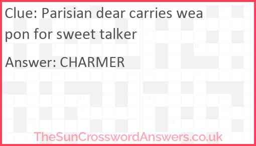 Parisian dear carries weapon for sweet talker is a crossword clue for which we have 1 possible answer and we have spotted 3 times in our database. This crossword clue was last seen on 04 December 2022 in The Sun Cryptic Crossword puzzle!