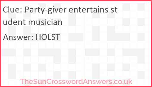 Party-giver entertains student musician is a crossword clue for which we have 1 possible answer and we have spotted 2 times in our database. This crossword clue was last seen on 07 June 2023 in The Sun Cryptic Crossword puzzle!