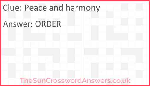 Peace and harmony is a crossword clue for which we have 1 possible answer and we have spotted 3 times in our database. This crossword clue was last seen on 18 April 2022 in The Sun Coffee Time Crossword puzzle!