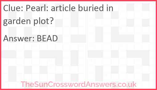 Pearl: article buried in garden plot? is a crossword clue for which we have 1 possible answer and we have spotted 1 times in our database. This crossword clue was last seen on 04 May 2024 in The Sun Cryptic Crossword puzzle!