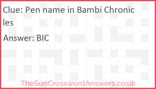 Pen name in Bambi Chronicles is a crossword clue for which we have 1 possible answer and we have spotted 1 times in our database. This crossword clue was last seen on 12 January 2024 in The Sun Cryptic Crossword puzzle!