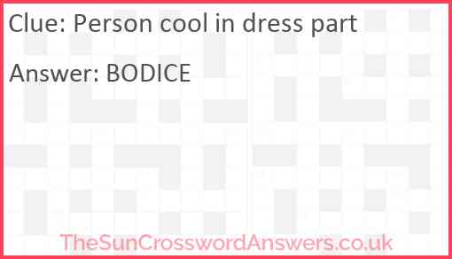 Person cool in dress part is a crossword clue for which we have 1 possible answer and we have spotted 2 times in our database. This crossword clue was last seen on 12 January 2025 in The Sun Cryptic Crossword puzzle!