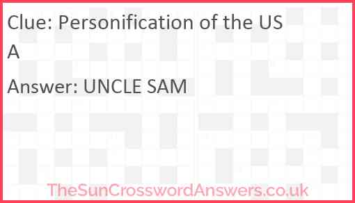 Personification of the USA is a crossword clue for which we have 1 possible answer and we have spotted 2 times in our database. This crossword clue was last seen on 17 December 2019 in The Sun Coffee Time Crossword puzzle!