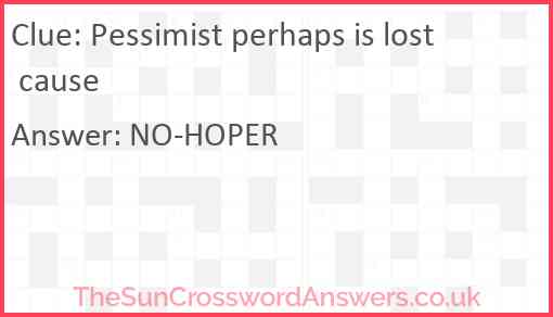 Pessimist perhaps is lost cause is a crossword clue for which we have 2 possible answer and we have spotted 3 times in our database. This crossword clue was last seen on 14 June 2025 in The Sun Cryptic Crossword puzzle!