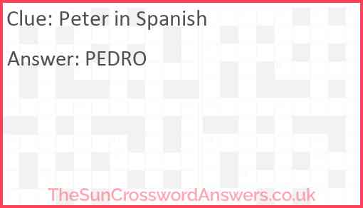 Peter in Spanish is a crossword clue for which we have 1 possible answer and we have spotted 1 times in our database. This crossword clue was last seen on 22 November 2020 in The Sun Coffee Time Crossword puzzle!