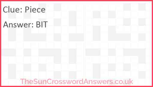 Piece is a crossword clue for which we have 1 possible answer and we have spotted 2 times in our database. This crossword clue was last seen on 16 August 2023 in The Sun Coffee Time Crossword puzzle!