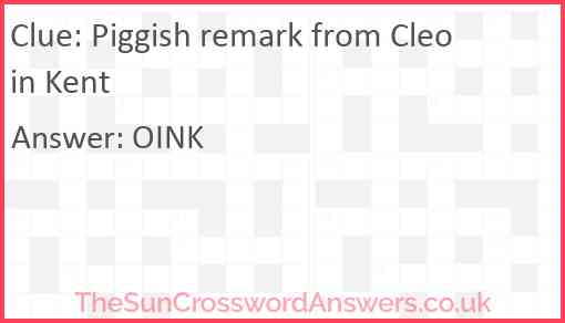 Piggish remark from Cleo in Kent is a crossword clue for which we have 1 possible answer and we have spotted 2 times in our database. This crossword clue was last seen on 25 December 2024 in The Sun Cryptic Crossword puzzle!