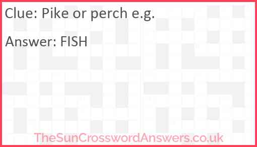 Pike or perch e.g. is a crossword clue for which we have 1 possible answer and we have spotted 1 times in our database. This crossword clue was last seen on 29 April 2022 in The Sun Coffee Time Crossword puzzle!