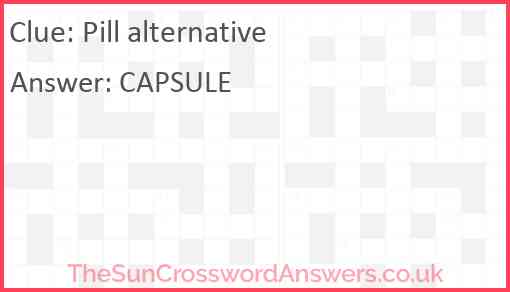 Pill alternative is a crossword clue for which we have 1 possible answer and we have spotted 4 times in our database. This crossword clue was last seen on 12 February 2025 in The Sun Coffee Time Crossword puzzle!