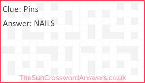 Pins is a crossword clue for which we have 1 possible answer and we have spotted 1 times in our database. This crossword clue was last seen on 25 June 2019 in The Sun Coffee Time Crossword puzzle!