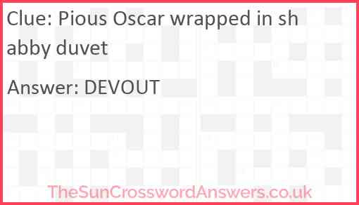 Pious Oscar wrapped in shabby duvet is a crossword clue for which we have 1 possible answer and we have spotted 3 times in our database. This crossword clue was last seen on 05 May 2025 in The Sun Cryptic Crossword puzzle!